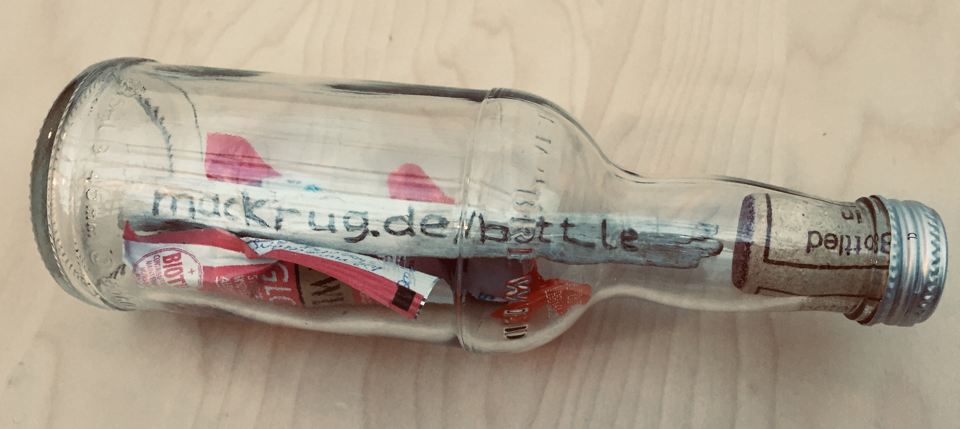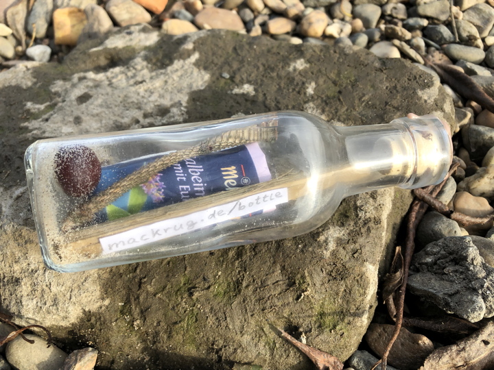 | Content: | Piece of wood with carved letters “mackrug.de/bottle”, chocolate, tea bag, coins |