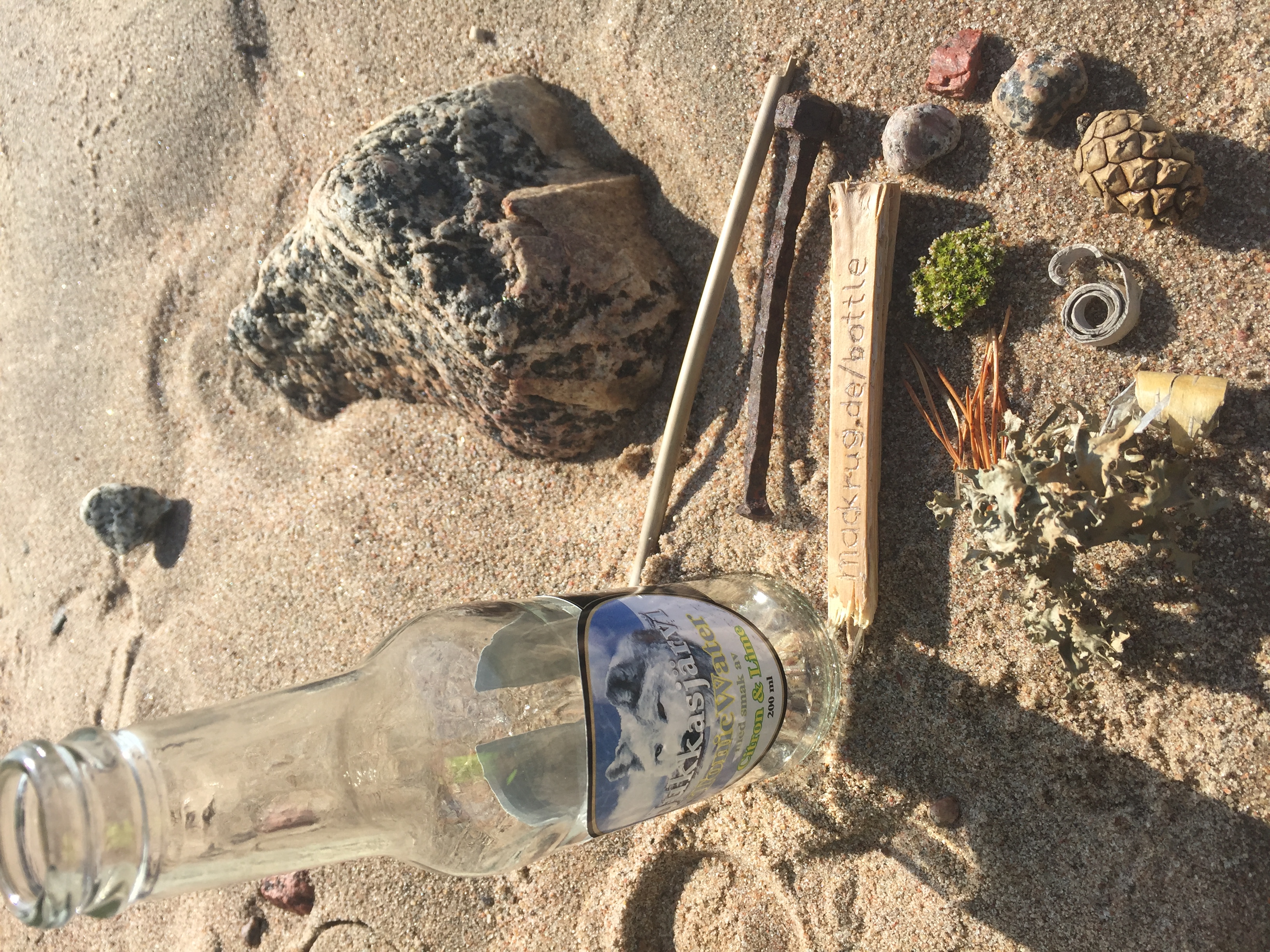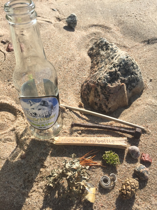 | Content: | Materials from beach, boarding pass with text “mackrug.de/bottle” |